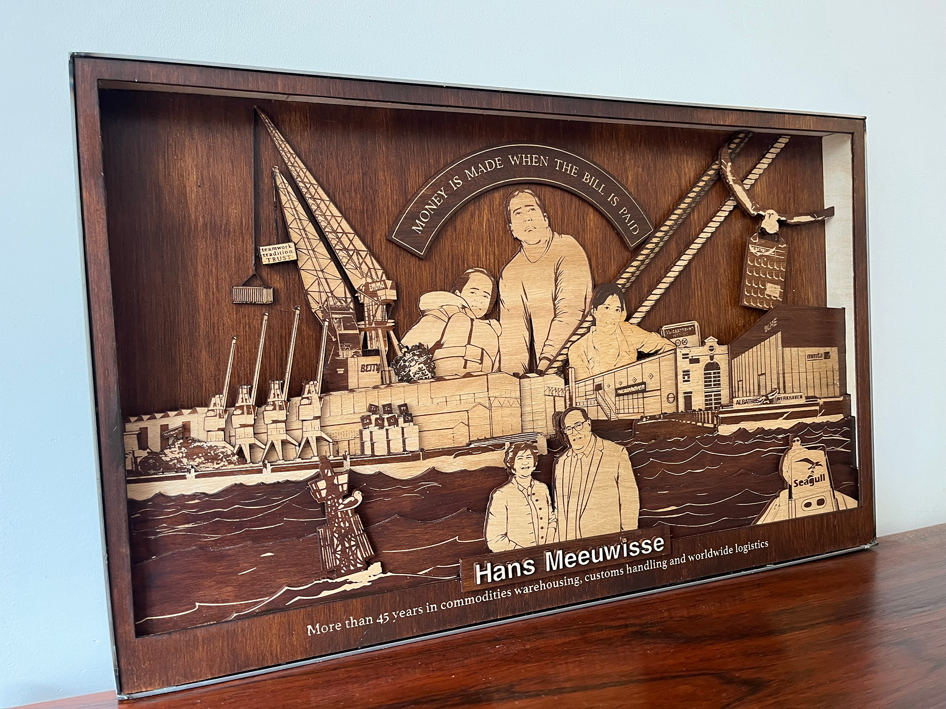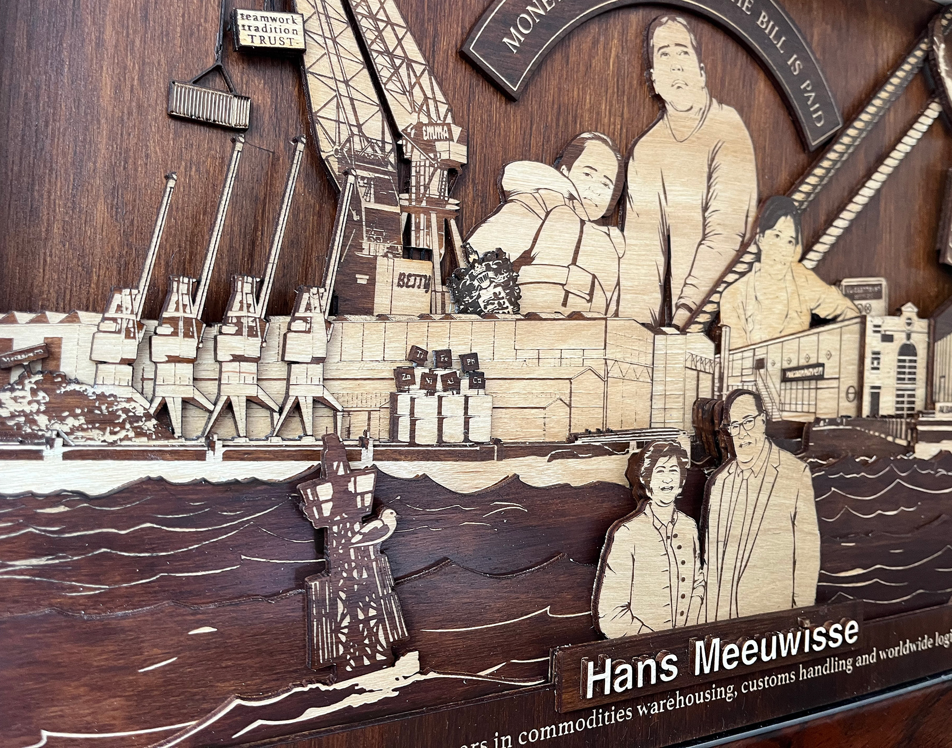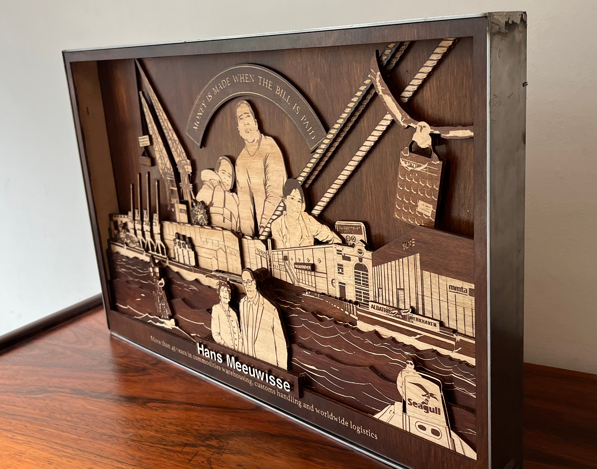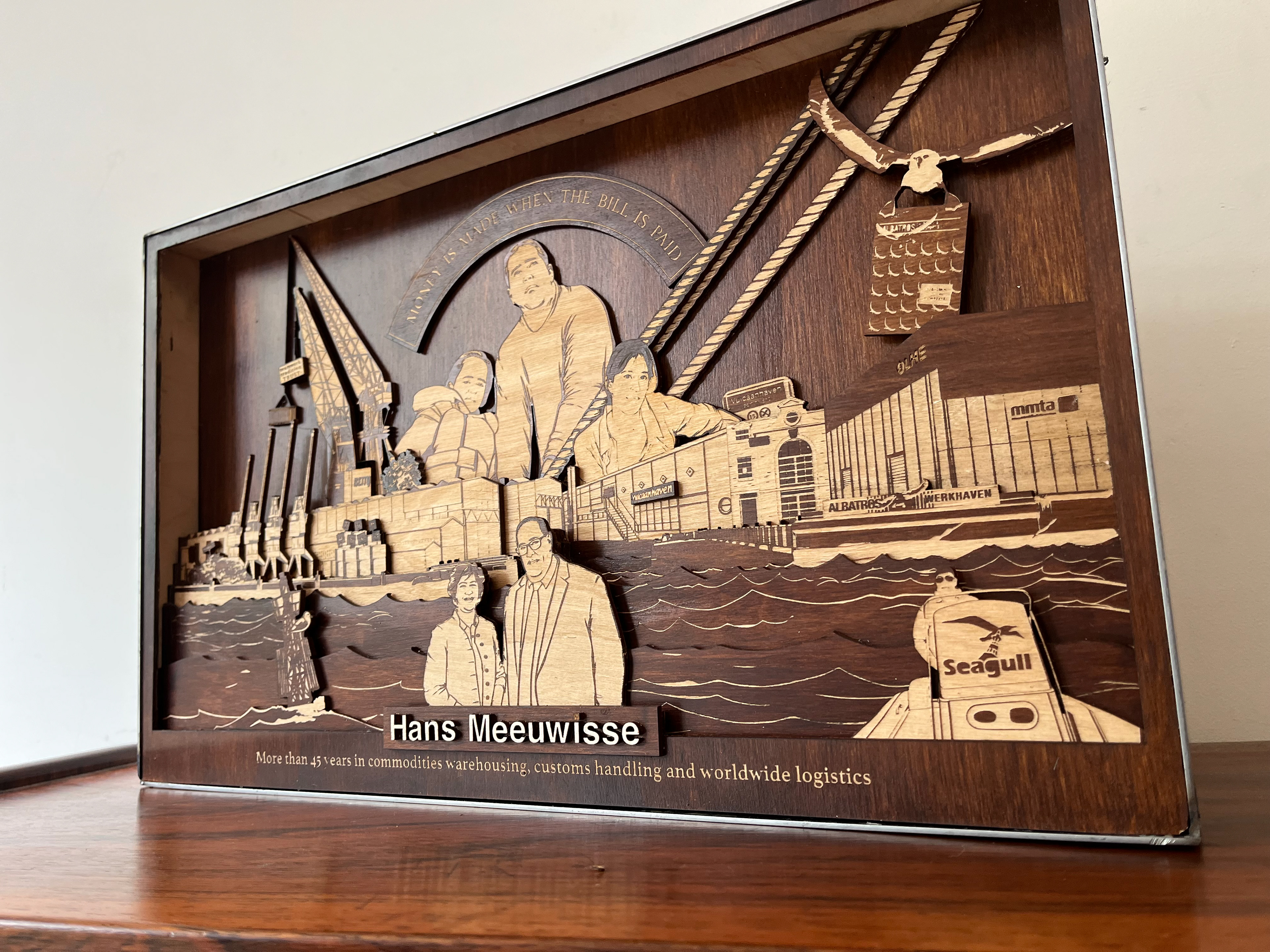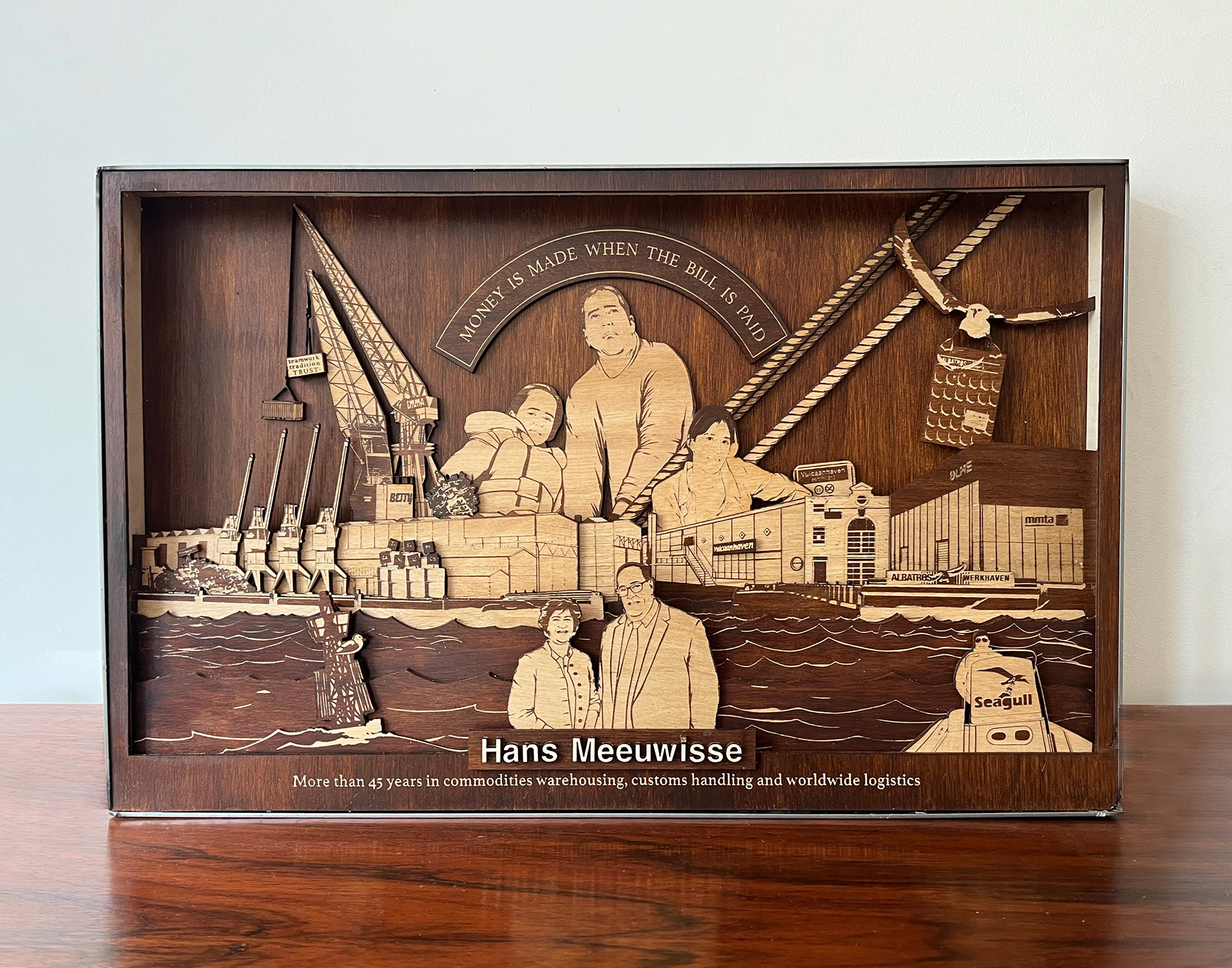 Met meer dan 45 jaar ervaring in hetzelfde vakgebied en aan het hoofd van meerdere bedrijven, verdiende Hans een ode die zijn toewijding, visie en nalatenschap weerspiegelt. Dit werk bestaat uit 10 zorgvuldig gegraveerde en gelaserde houten platen, met meerdere illustraties die naar een prestatie of gebeurtenis verwijzen. Samen vormen ze een gelaagd geheel waarin zowel zijn professionele mijlpalen als zijn familie een centrale rol spelen.